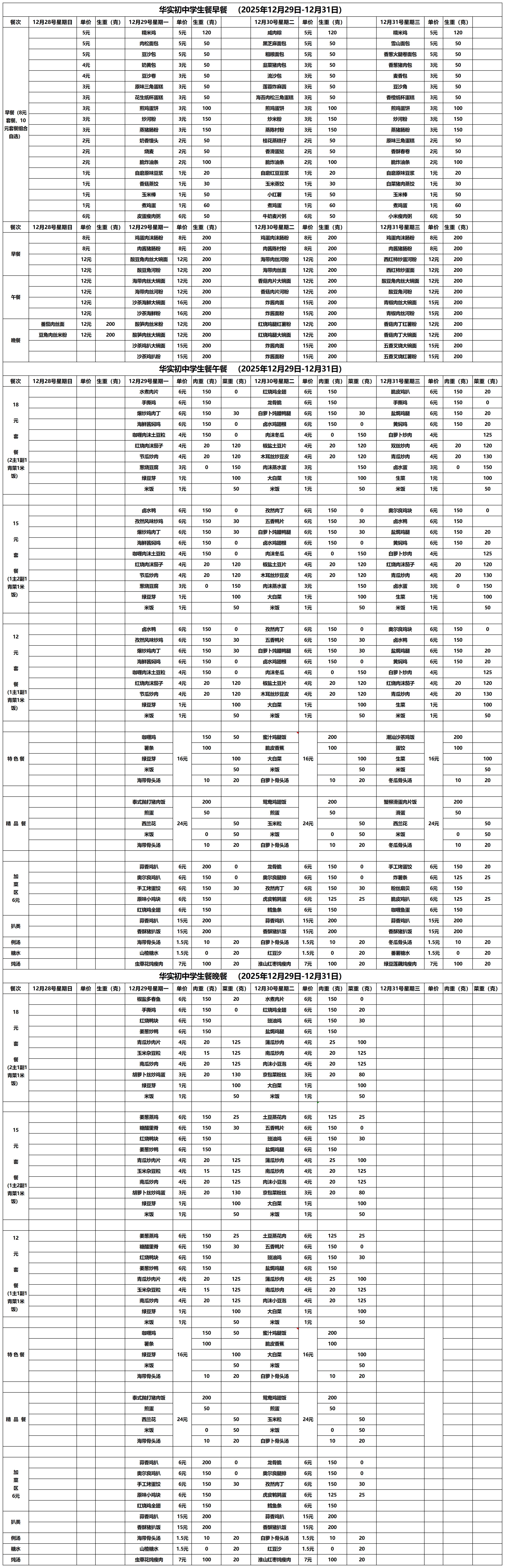 2025--2026学年第一学期第18周学生餐厅菜单