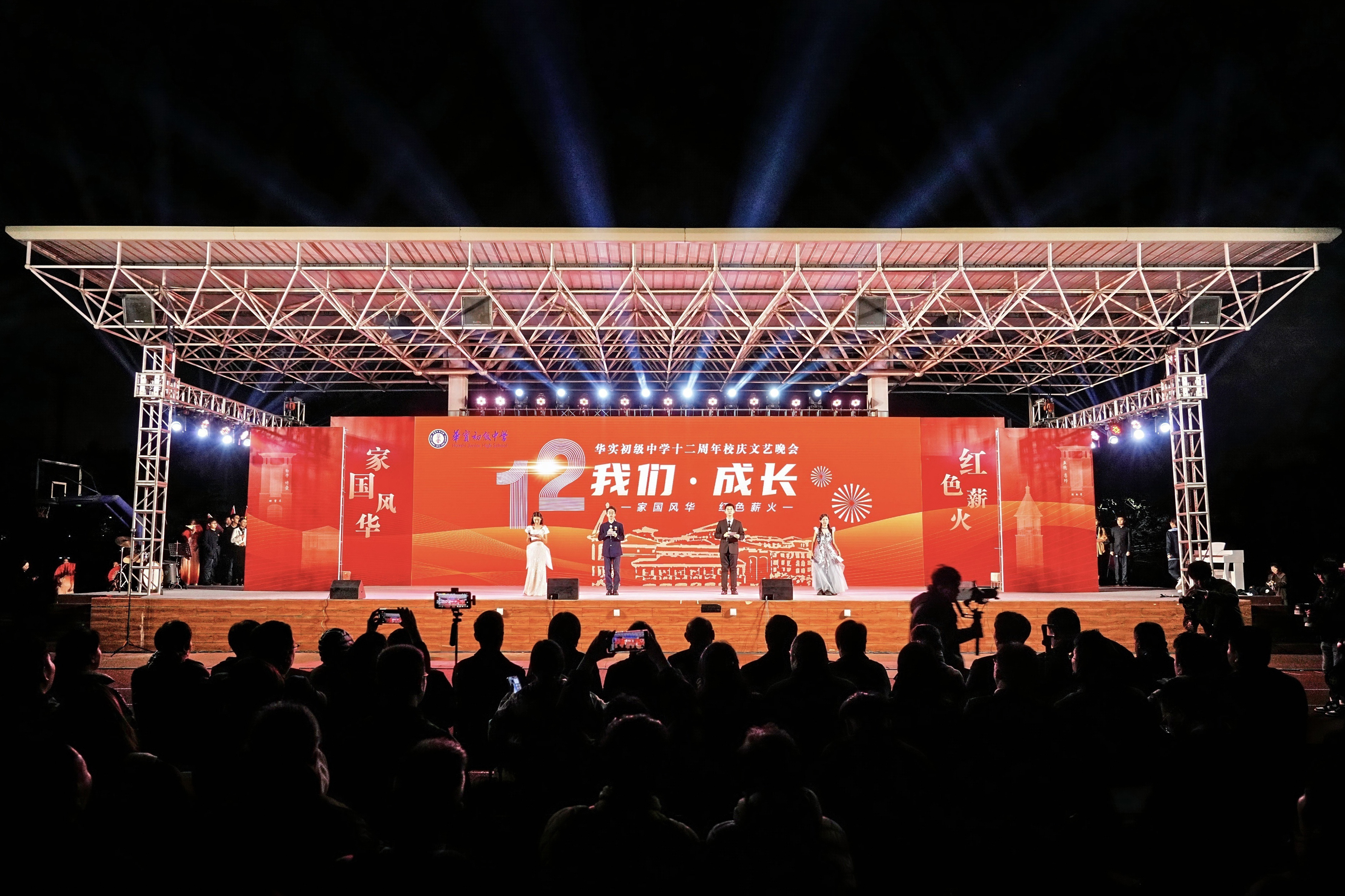 随着暮色降临,华实初级中学十二周年校庆“红色薪火 家国风华”文艺晚会在万众期待中拉开帷幕。大屏幕上暖场视频缓缓播放,校园里的晨读时光、运动会上的呐喊、课间的欢声笑语……一幕幕熟悉的画面,勾起全场华初人的共同记忆,空气中充盈着期待与感动。