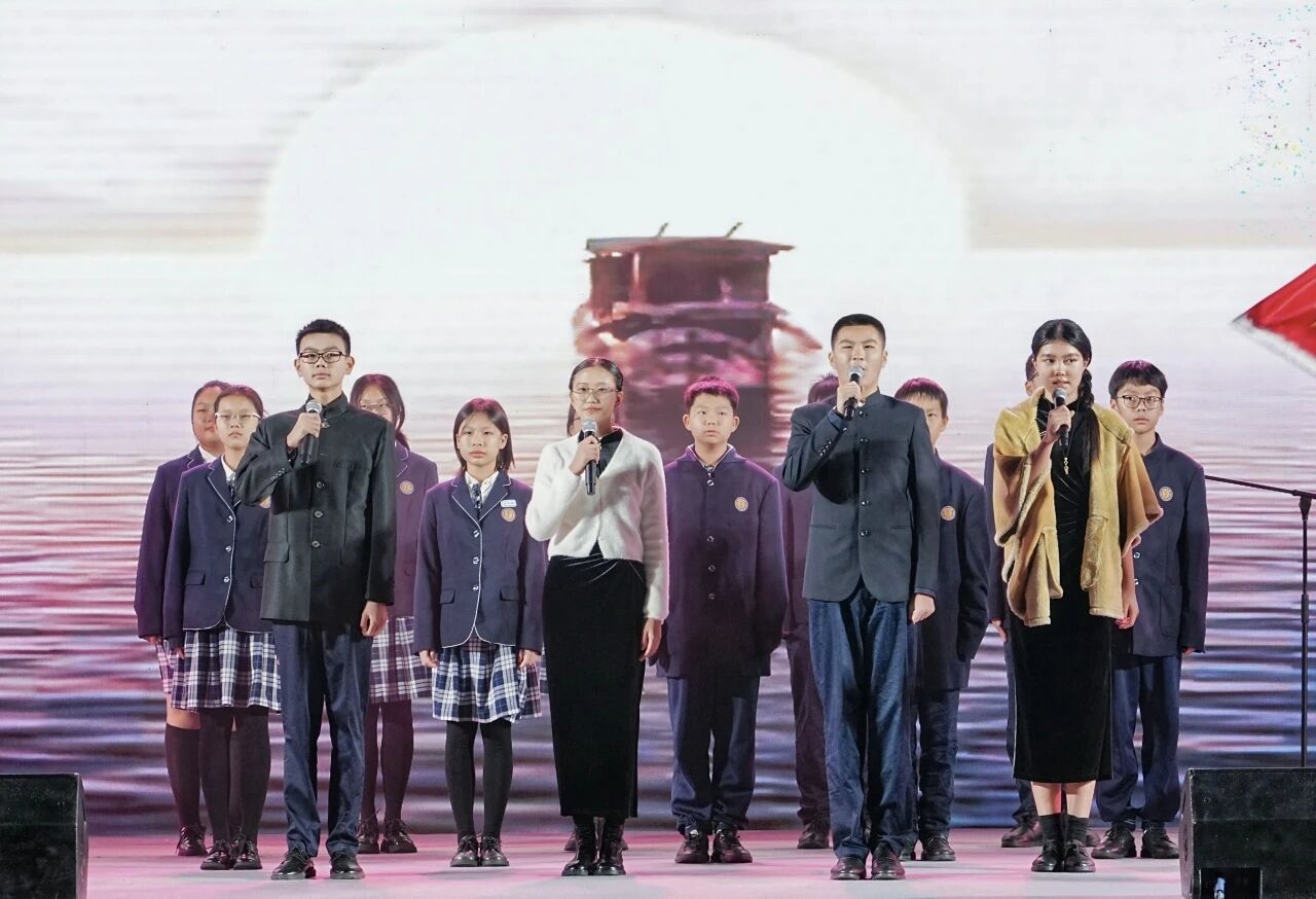 翻开历史的书页,红色精神穿越时空。七(9)班、七(10)班的同学们带来诗朗诵《红船从南湖启航》,深情追溯风雨如磐的岁月。