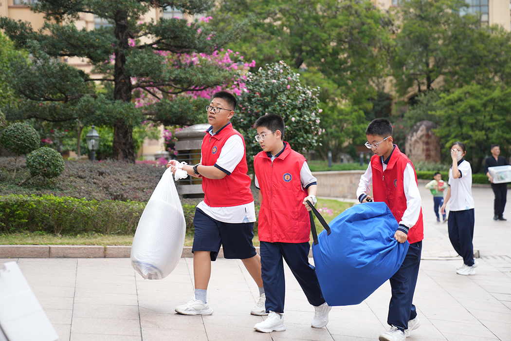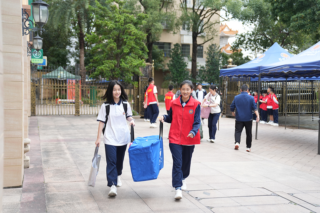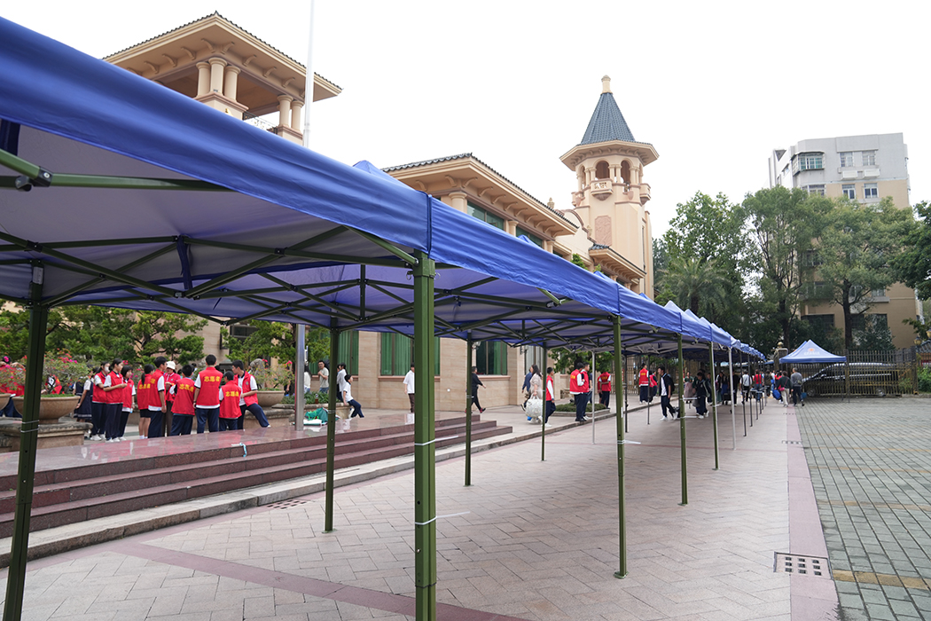 考虑到连绵春雨,学校提前在校园要道搭建遮雨帐篷,为同学们撑起一条“暖心通道”,保证搬运行李入校的路途干爽安全。师生志愿者和校警队伍守候在学校门口,主动上前帮扶提拿、细心指引方向,有的接过家长手中的行李箱,有的帮同学扛被褥,用行动为返校之路增添温暖。