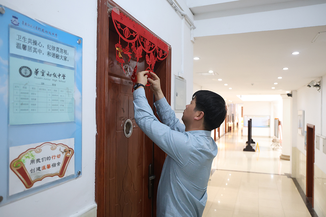 推开宿舍门,是生活老师亲切的笑脸。为了让学生们返校就有整洁舒适的居住环境,生活老师们提前几天到岗,开窗通风、打扫卫生,更布置上元月喜庆颜色。今天,他们更是早早守候在楼层,帮助学生整理床铺、归置物品。