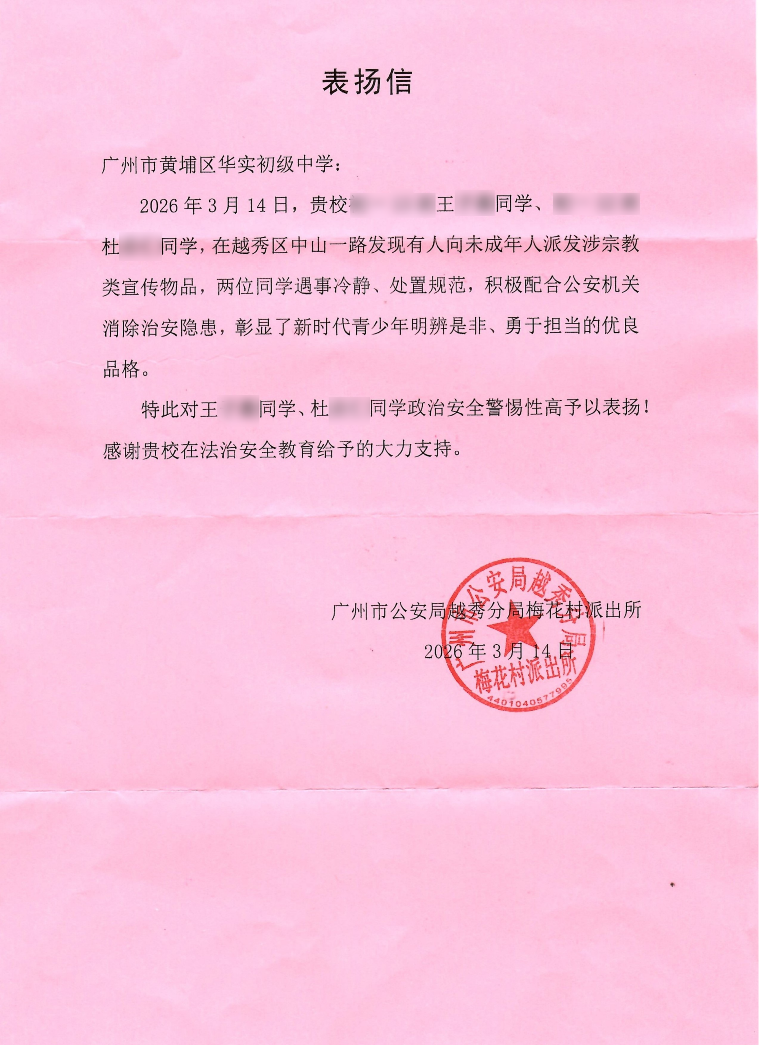 面对街头派发的涉宗教可疑材料,是视而不见匆匆走开,还是沉着应对主动作为?华实初级中学的七年级学生王同学、杜同学,用实际行动给出了满分答案!他们凭借敏锐的辨别力、冷静的处事能力和强烈的社会责任感,配合警方消除一起治安隐患,体现了我校素质教育的扎实成效。