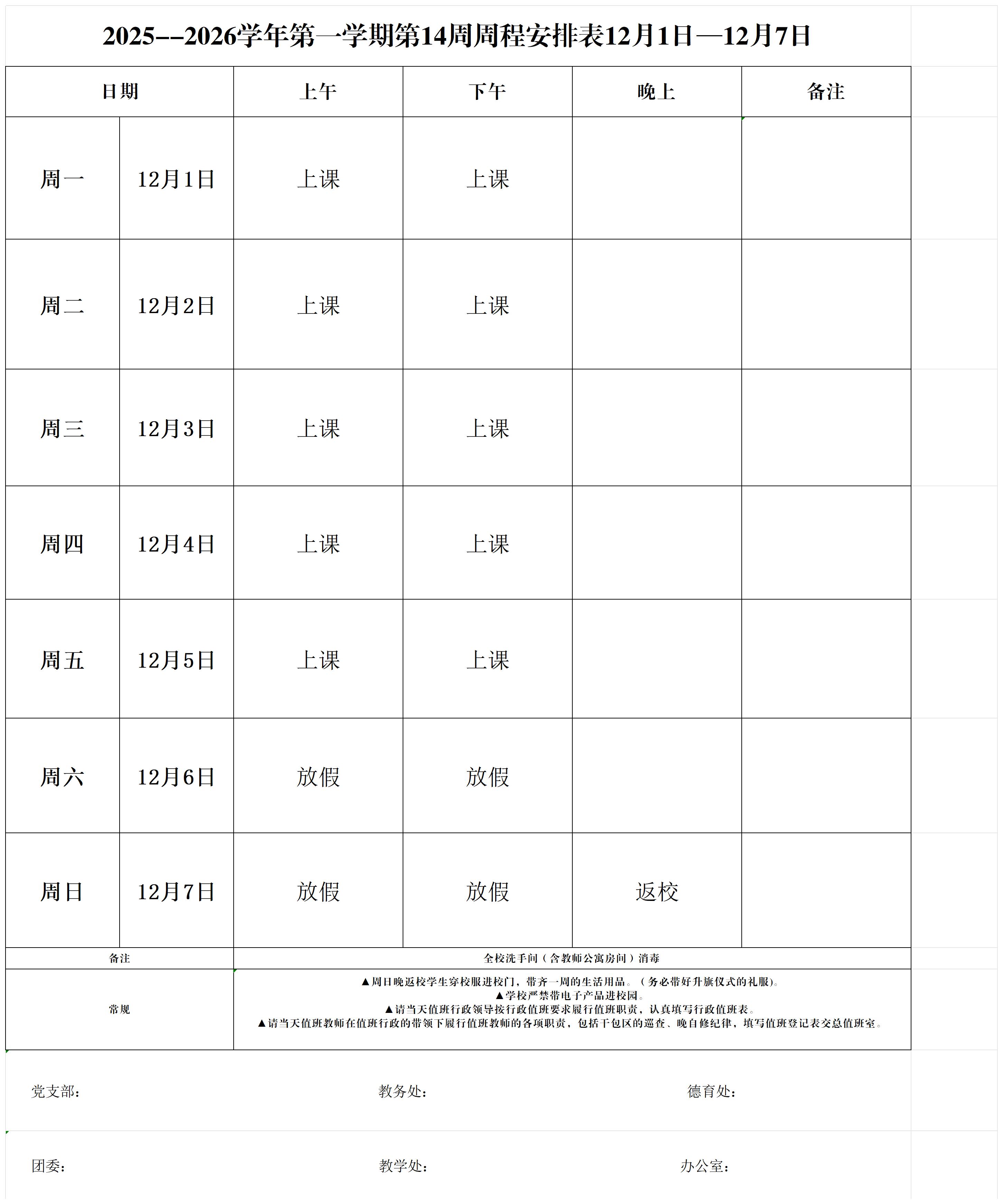 2025--2026学年第一学期第14周周程安排表